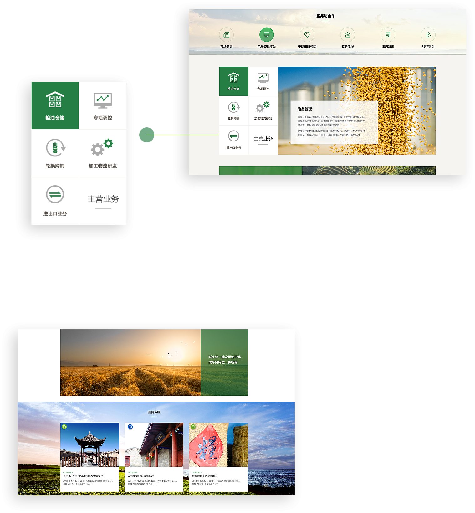 中儲糧官網采用扁平化ICON的方式,集中展示儲備管理、輪換購銷、專項調控等多元業務,在保證用戶便于閱讀的基礎上,通過創意、交互吸引用戶關注。