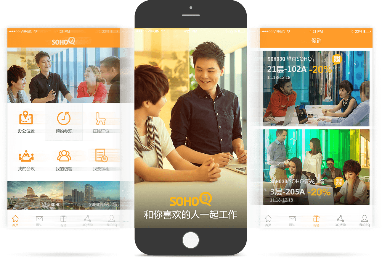 SOHO中國提供了一個現代化的共享辦公空間,并且面向短租、個性化租賃人群打造了自由、平等、多元的O2O電商服務平臺,不同行業、不同背景的人可以一起在線交流、碰撞、分享,用戶登錄官網即可完成自由選房、訂房、簽約、付款等完整的租賃流程。