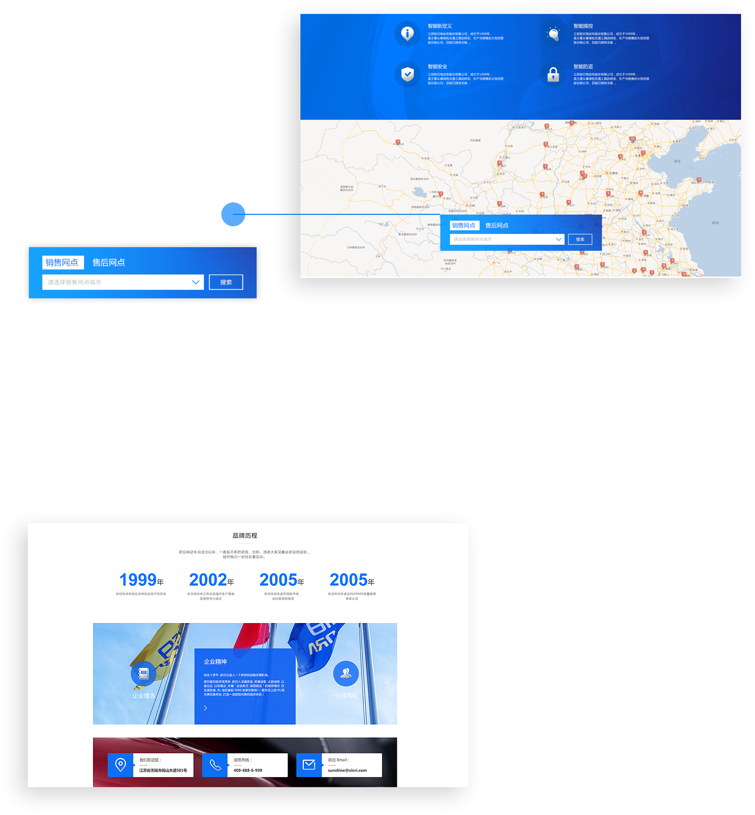 新日電動車官網(wǎng)調(diào)取百度地圖實(shí)時(shí)數(shù)據(jù),通過標(biāo)簽定位的方式,實(shí)現(xiàn)銷售網(wǎng)點(diǎn)、售后網(wǎng)點(diǎn)的查詢,極大的方便了用戶,提升了服務(wù)質(zhì)量和銷售渠道。