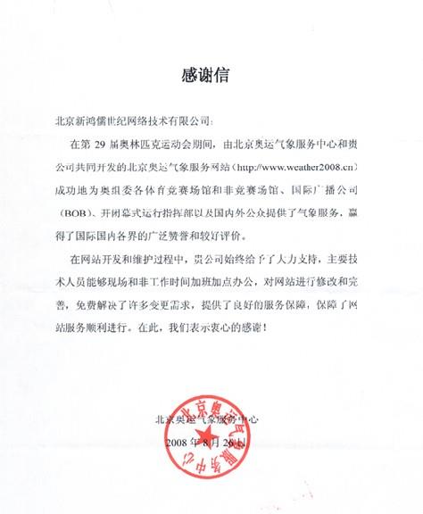 北京奧運氣象服務中心在此次項目中看到了新鴻儒的實力和努力! 并對北京奧運會氣象服務網站高度滿意,特此發來表揚信,以示鼓勵和贊揚!