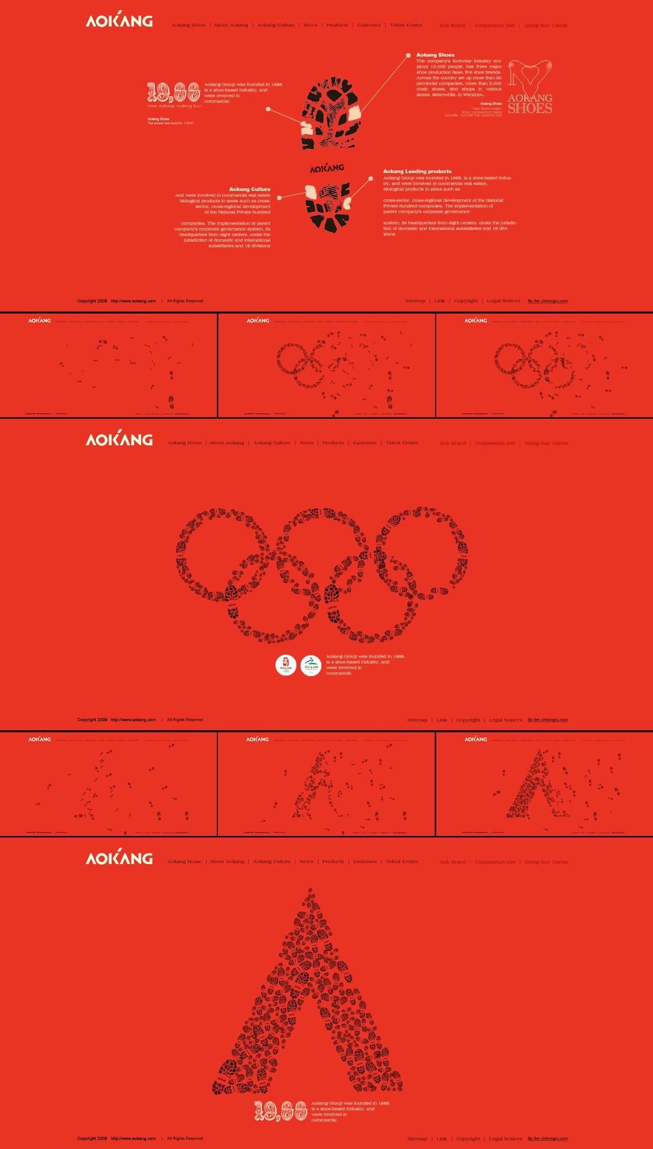 如圖所示,新鴻儒根據奧康集團所在行業優勢,將企業發展核心配合鞋印動態展示,生動直觀;又結合奧康集團作為2008年奧運贊助商這一特征,以鞋印組成奧運五環,放大其奧運精神;最終,鞋印組合為奧康集團標志性logo,升華企業文化。