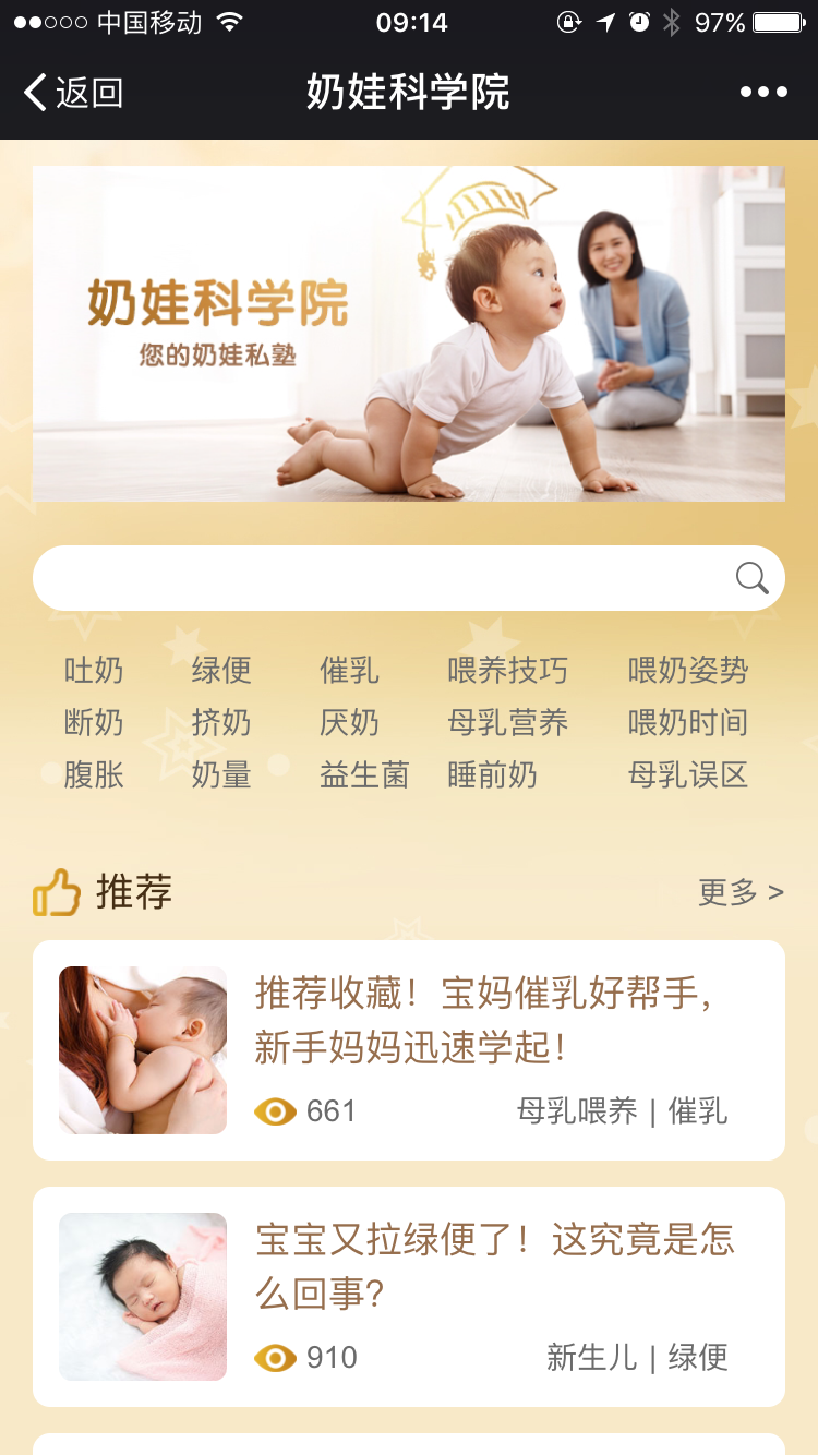 【奶娃科學院】是一檔專業知識欄目,新鴻儒通過分析行業大數據以及用戶需求,制定了整個欄目的標簽方案,以不同緯度的關鍵詞,撰寫深度奶娃文章,帶給媽媽們更專業、更科學的答案;