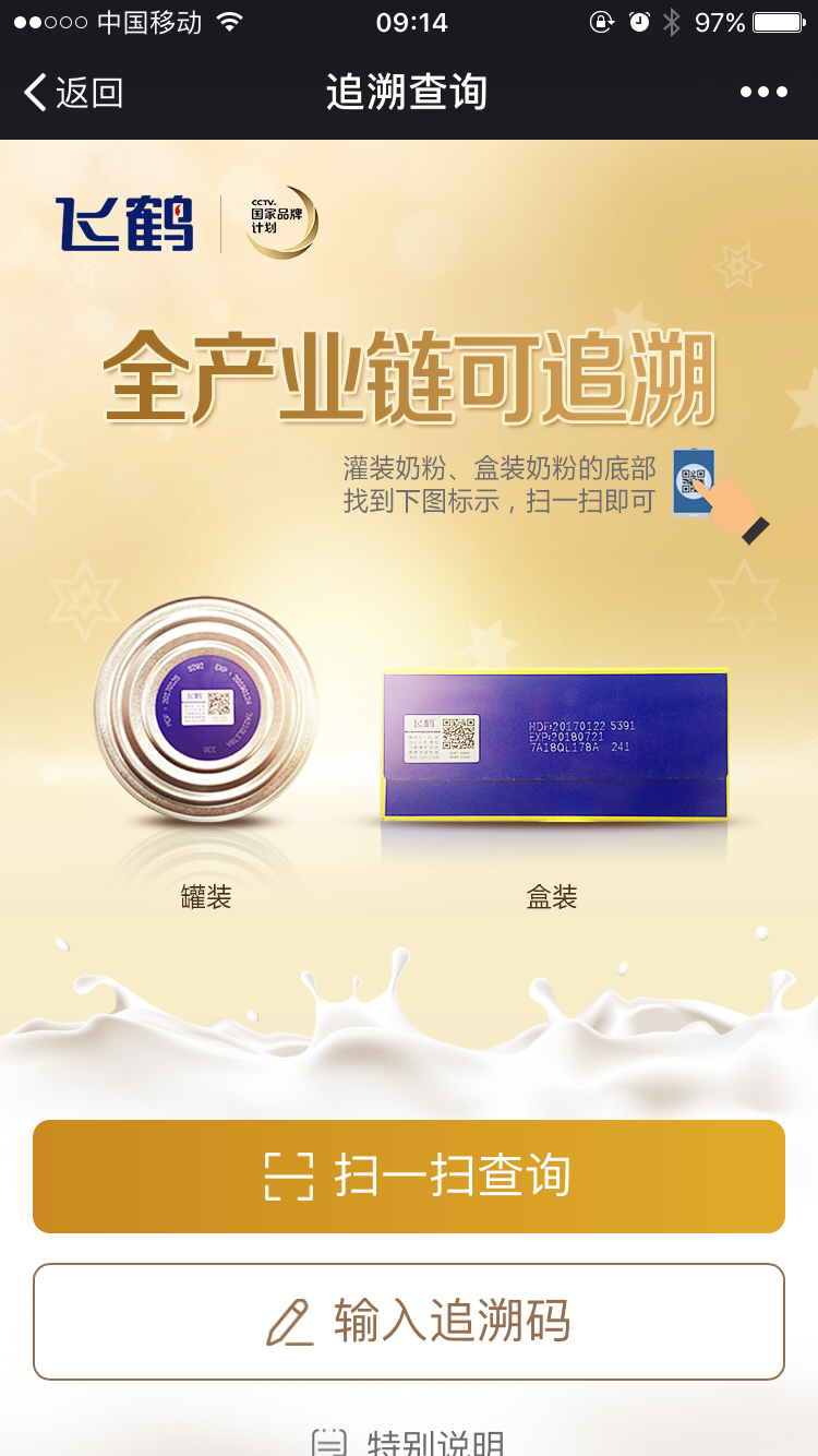 【產品追溯】對接產品生產系統,支持用戶實時查詢每一罐奶粉的出處,讓寶寶喝得更放心,媽媽更安心。